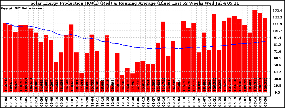 20070704 Weekly Solar Energy Production Running Average Last 52 Weeks