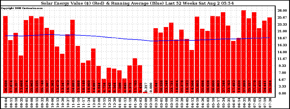 20080802 Weekly Solar Energy Production Value Running Average Last 52 Weeks
