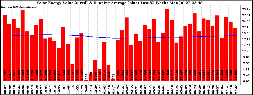 20090727 Weekly Solar Energy Production Value Running Average Last 52 Weeks