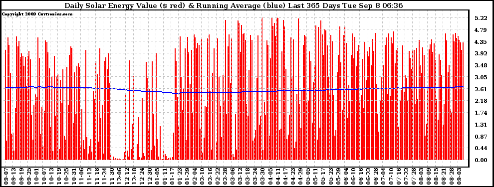 20090908 Daily Solar Energy Production Value Running Average Last 365 Days