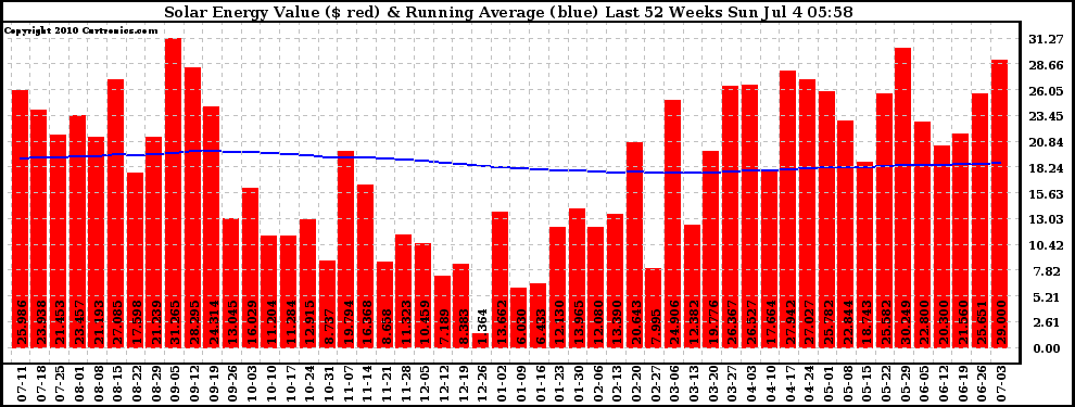 20100704 Weekly Solar Energy Production Value Running Average Last 52 Weeks