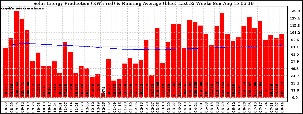 20100815 Weekly Solar Energy Production Running Average Last 52 Weeks