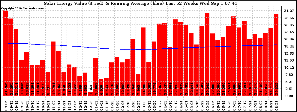 20100901 Weekly Solar Energy Production Value Running Average Last 52 Weeks