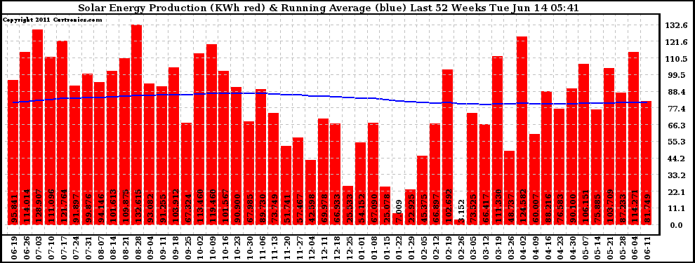 20110614 Weekly Solar Energy Production Running Average Last 52 Weeks