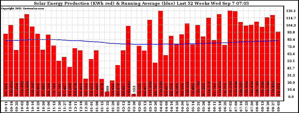 20110907 Weekly Solar Energy Production Running Average Last 52 Weeks