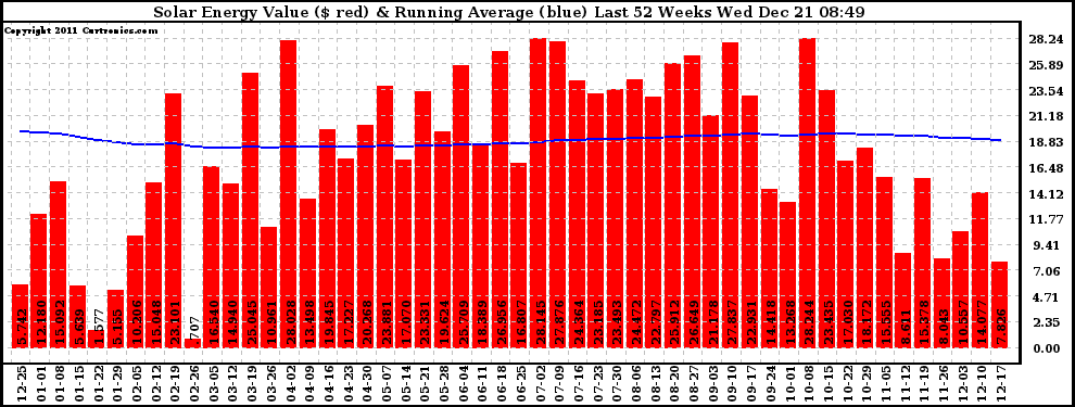 20111221 Weekly Solar Energy Production Value Running Average Last 52 Weeks