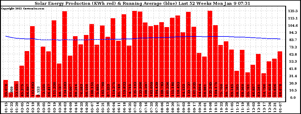 20120109 Weekly Solar Energy Production Running Average Last 52 Weeks