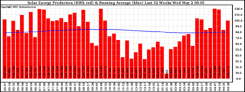 20120502 Weekly Solar Energy Production Running Average Last 52 Weeks