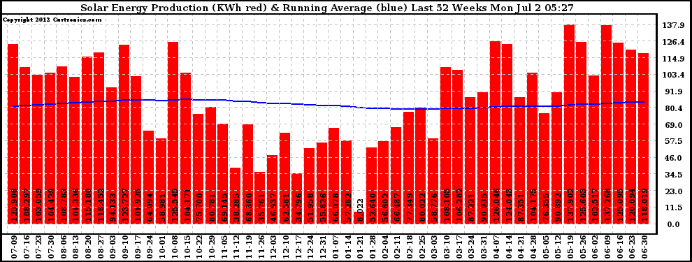 20120702 Weekly Solar Energy Production Running Average Last 52 Weeks