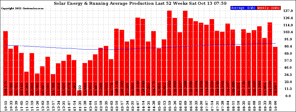 20121013 Weekly Solar Energy Production Running Average Last 52 Weeks