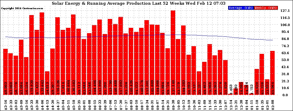 20140212 Weekly Solar Energy Production Running Average Last 52 Weeks