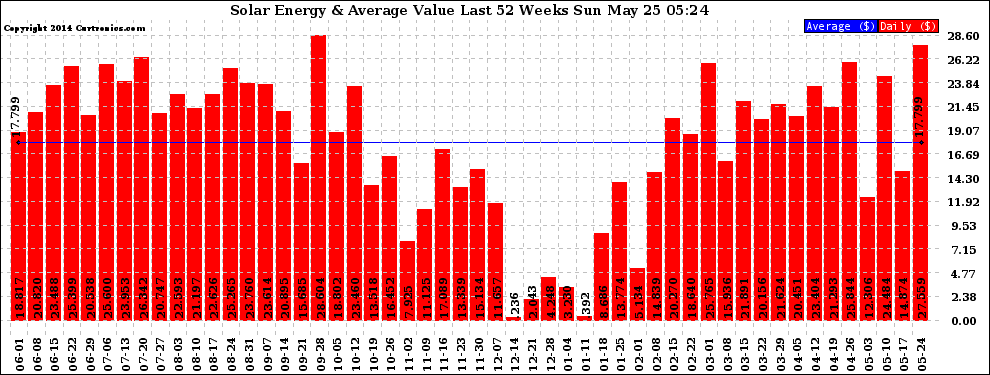 20140525 Weekly Solar Energy Production Value Last 52 Weeks