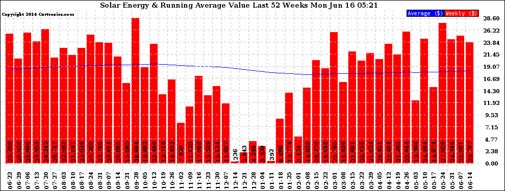 20140616 Weekly Solar Energy Production Value Running Average Last 52 Weeks
