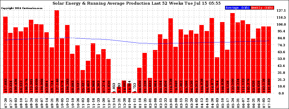 20140715 Weekly Solar Energy Production Running Average Last 52 Weeks