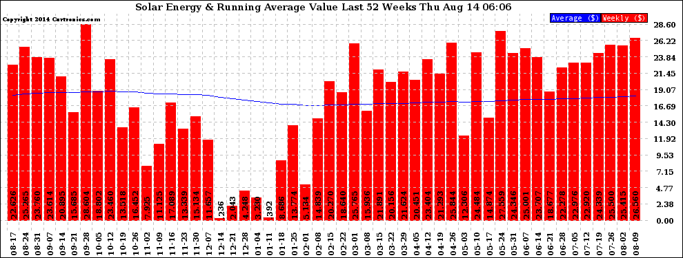 20140814 Weekly Solar Energy Production Value Running Average Last 52 Weeks