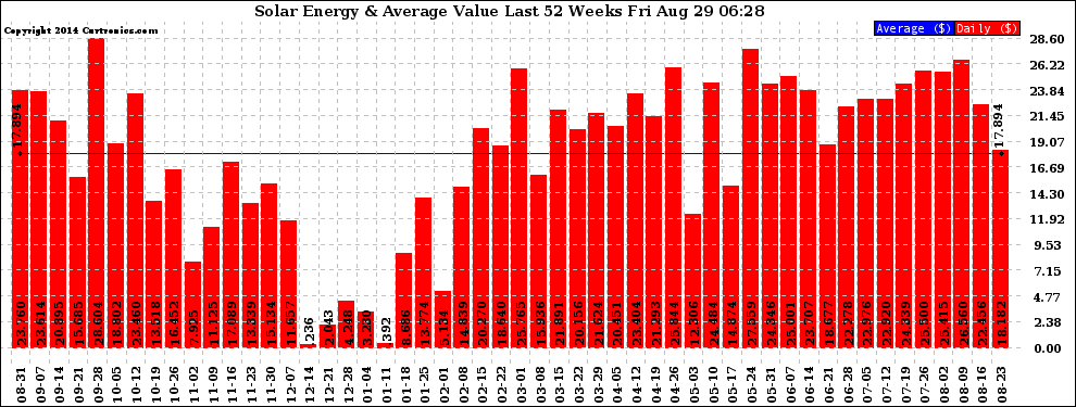 20140829 Weekly Solar Energy Production Value Last 52 Weeks