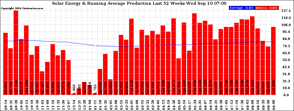 20140910 Weekly Solar Energy Production Running Average Last 52 Weeks