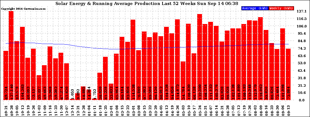 20140914 Weekly Solar Energy Production Running Average Last 52 Weeks