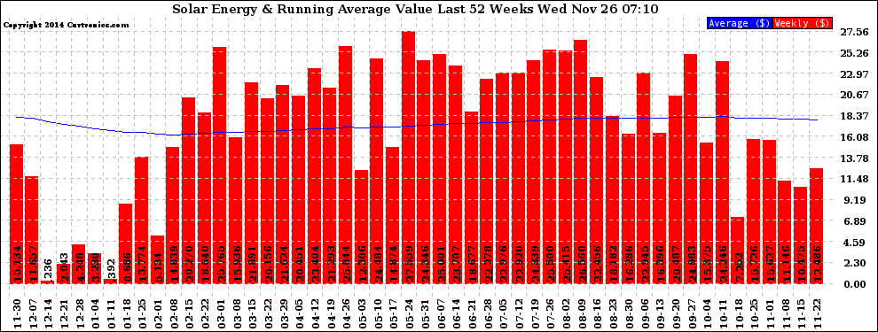 20141126 Weekly Solar Energy Production Value Running Average Last 52 Weeks