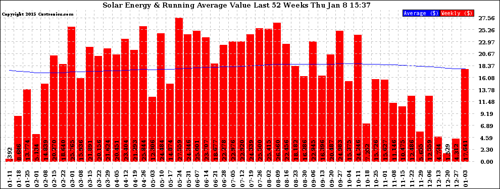20150108 Weekly Solar Energy Production Value Running Average Last 52 Weeks