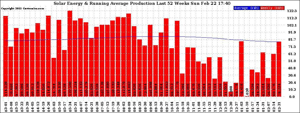 20150222 Weekly Solar Energy Production Running Average Last 52 Weeks