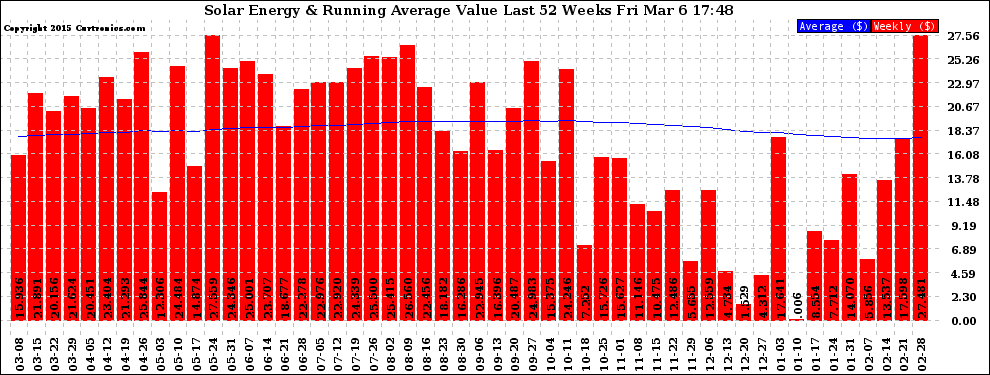 20150306 Weekly Solar Energy Production Value Running Average Last 52 Weeks
