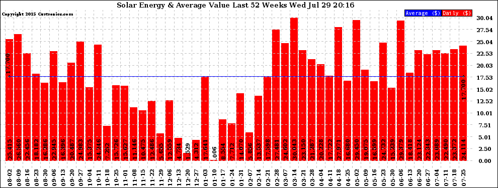 20150729 Weekly Solar Energy Production Value Last 52 Weeks