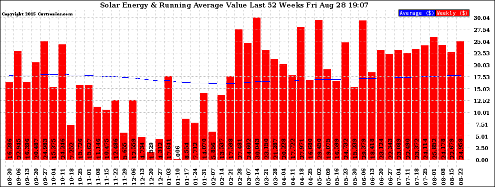 20150828 Weekly Solar Energy Production Value Running Average Last 52 Weeks
