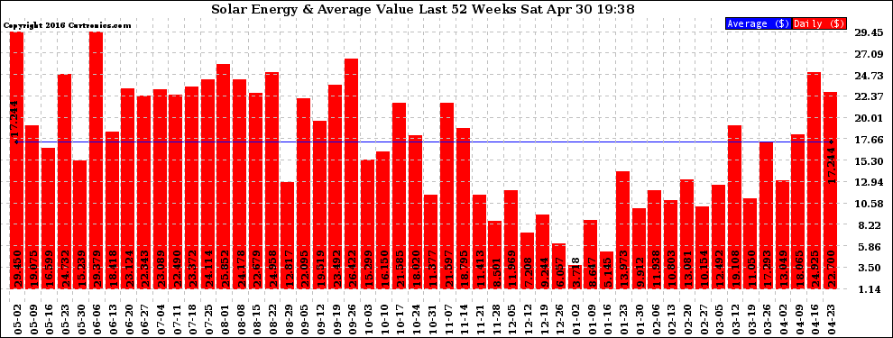 20160430 Weekly Solar Energy Production Value Last 52 Weeks