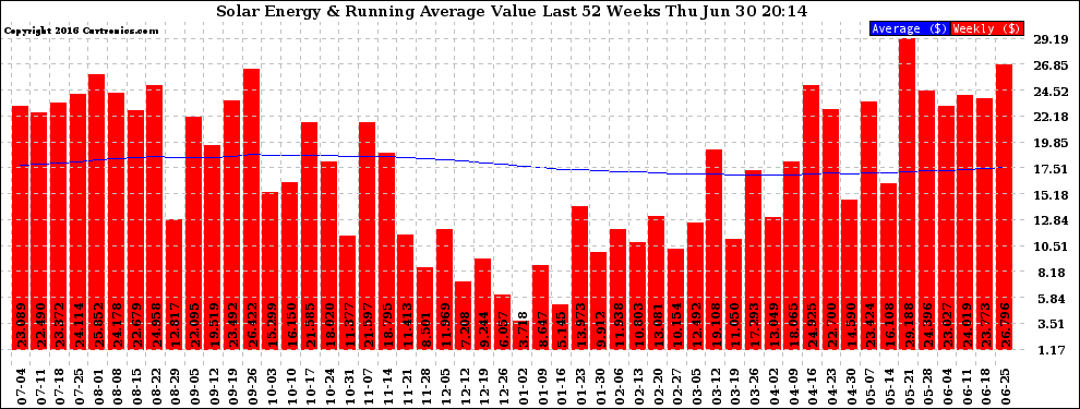 20160630 Weekly Solar Energy Production Value Running Average Last 52 Weeks