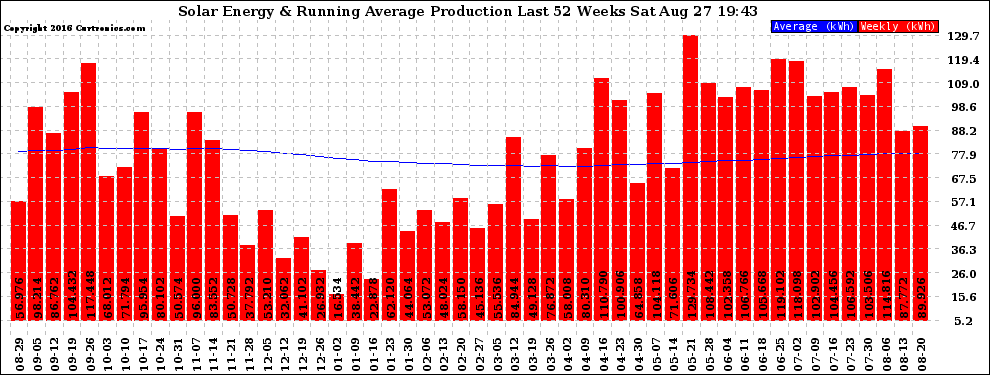 20160827 Weekly Solar Energy Production Running Average Last 52 Weeks