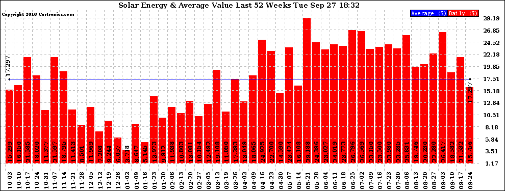 20160927 Weekly Solar Energy Production Value Last 52 Weeks