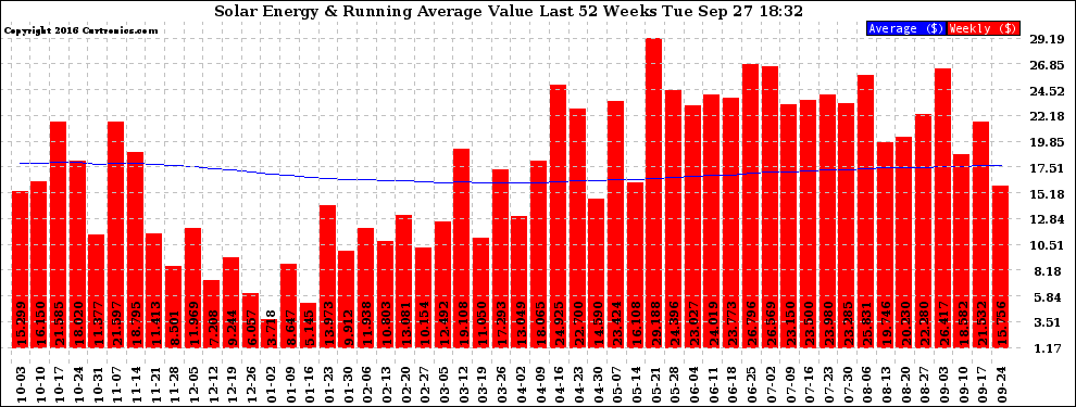 20160927 Weekly Solar Energy Production Value Running Average Last 52 Weeks