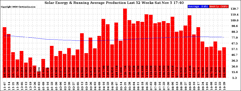 20161105 Weekly Solar Energy Production Running Average Last 52 Weeks