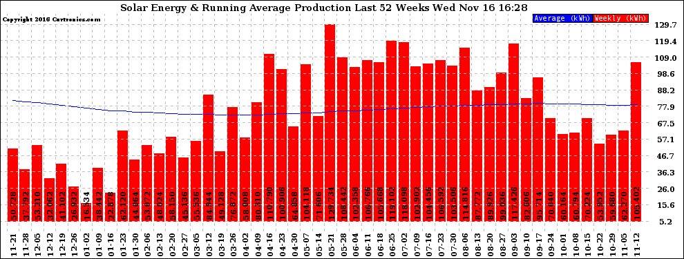 20161116 Weekly Solar Energy Production Running Average Last 52 Weeks