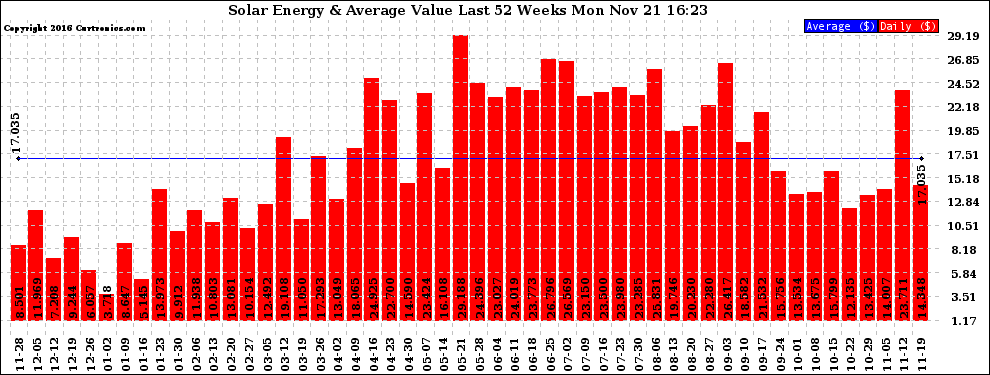 20161121 Weekly Solar Energy Production Value Last 52 Weeks
