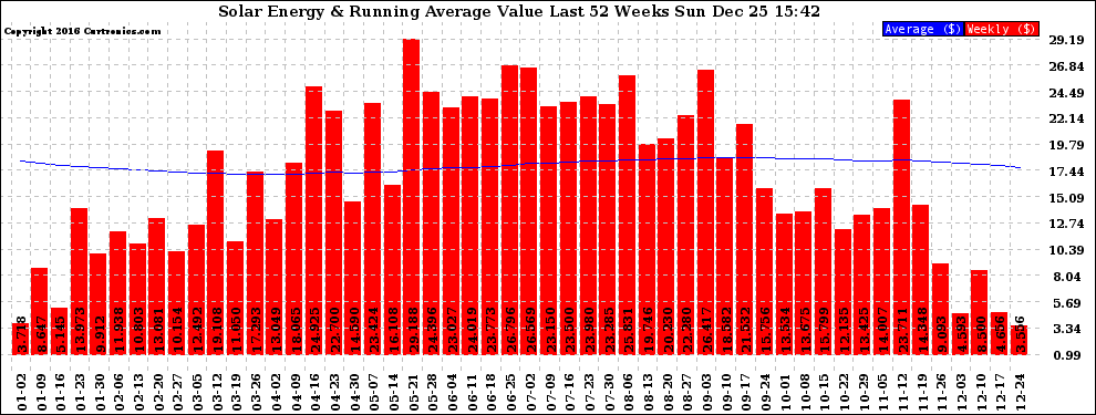 20161225 Weekly Solar Energy Production Value Running Average Last 52 Weeks