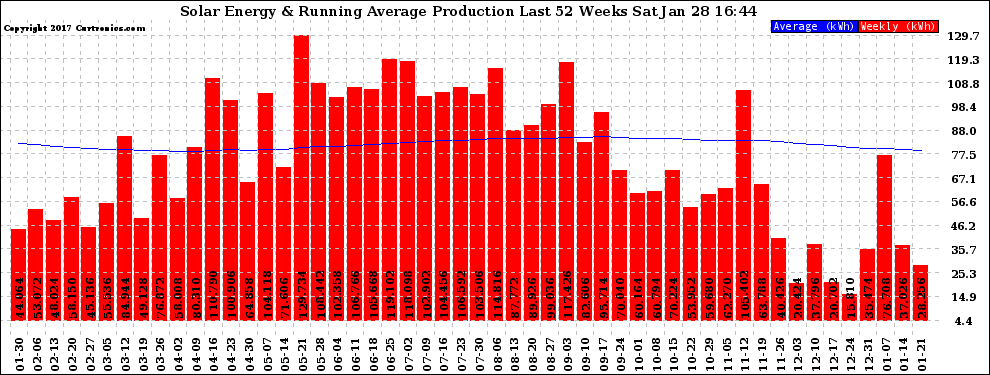 20170128 Weekly Solar Energy Production Running Average Last 52 Weeks