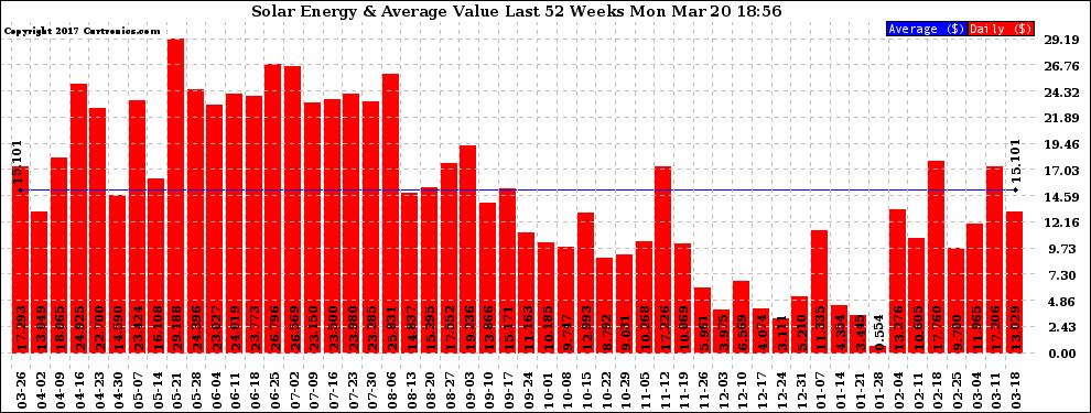 20170320 Weekly Solar Energy Production Value Last 52 Weeks