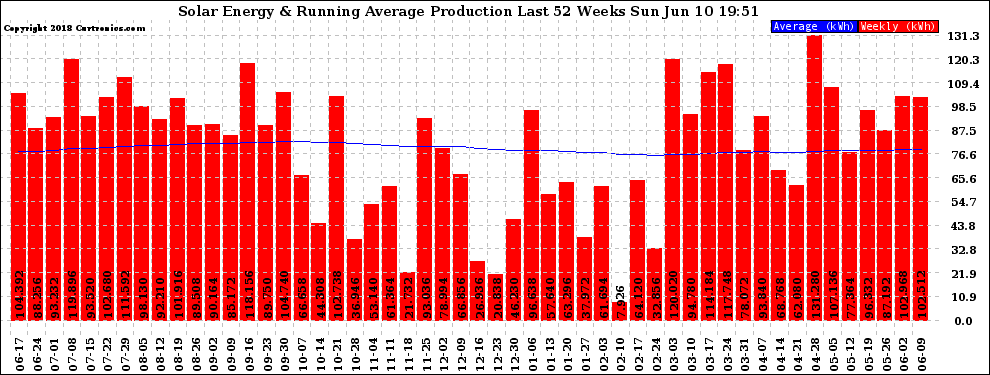 20180610 Weekly Solar Energy Production Running Average Last 52 Weeks