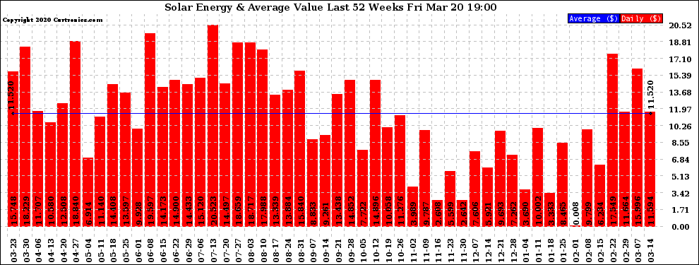 20200320 Weekly Solar Energy Production Value Last 52 Weeks