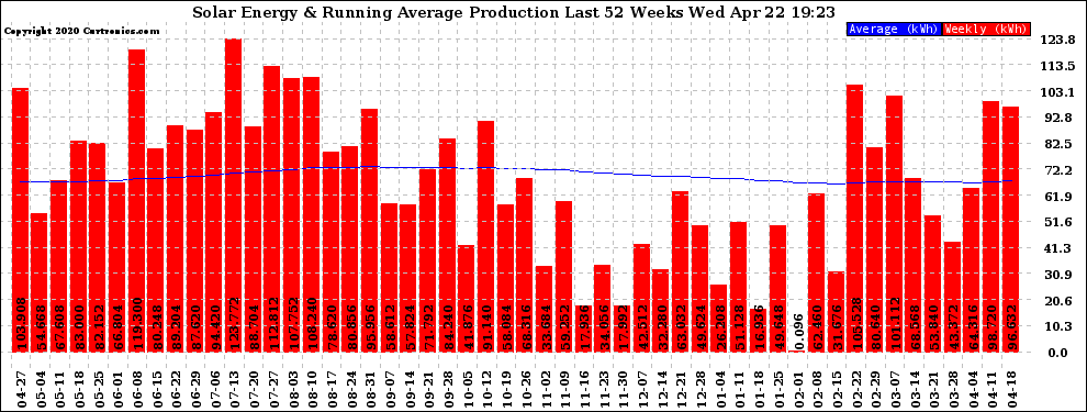20200422 Weekly Solar Energy Production Running Average Last 52 Weeks