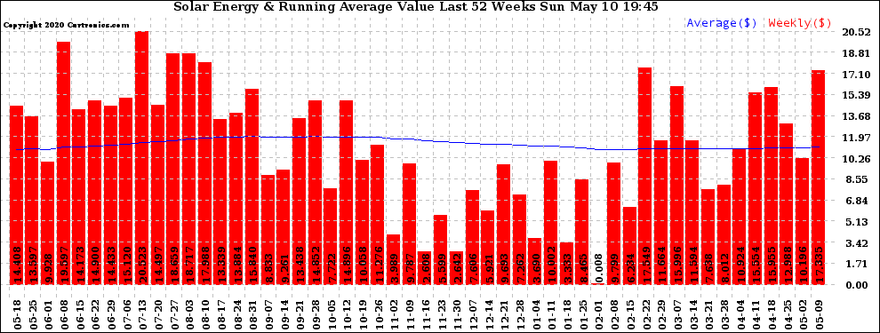 20200510 Weekly Solar Energy Production Value Running Average Last 52 Weeks