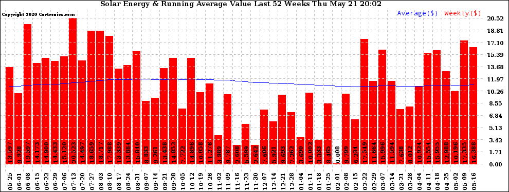 20200521 Weekly Solar Energy Production Value Running Average Last 52 Weeks