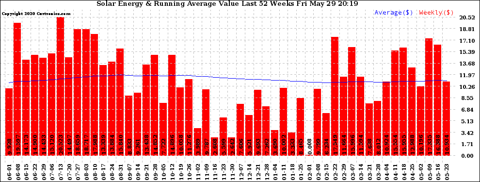 20200529 Weekly Solar Energy Production Value Running Average Last 52 Weeks