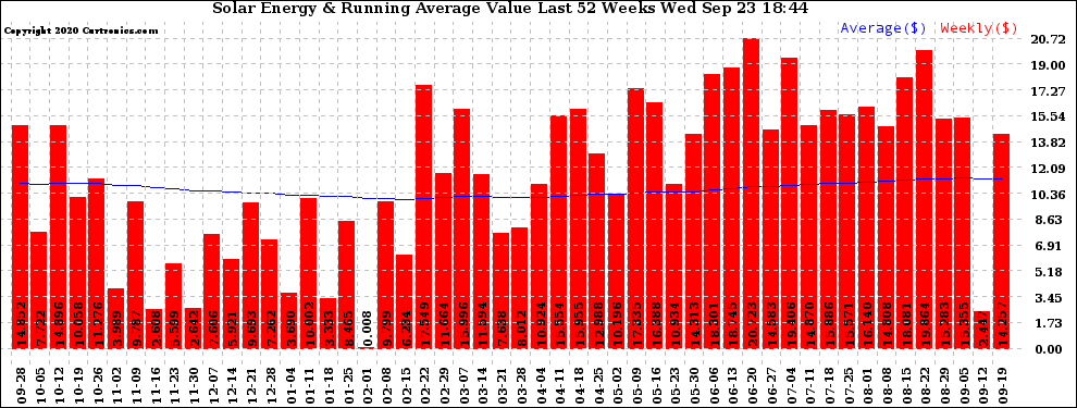 20200923 Weekly Solar Energy Production Value Running Average Last 52 Weeks