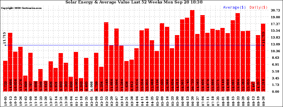 20200928 Weekly Solar Energy Production Value Last 52 Weeks