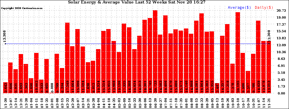20201128 Weekly Solar Energy Production Value Last 52 Weeks