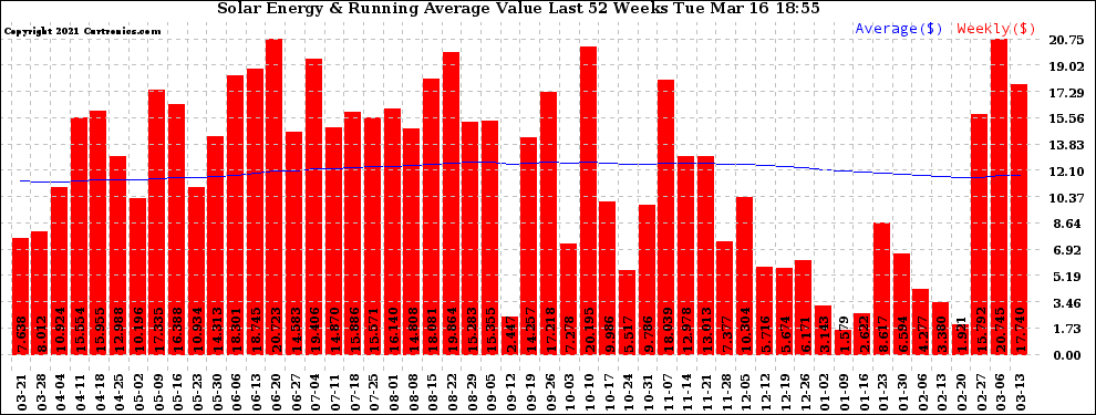 20210316 Weekly Solar Energy Production Value Running Average Last 52 Weeks