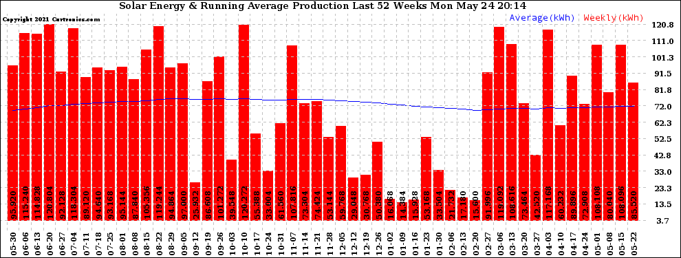 20210524 Weekly Solar Energy Production Running Average Last 52 Weeks